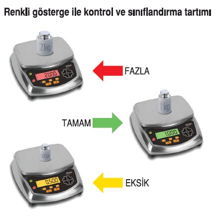 Multi colored LCD display with backlight can be easily and programmed to provide different color for different weight values. This feature provides fast and safe weight control operation in meat, fish, frozen food, fruit and vegetable processing and packing lines and all kind of industrial packing applications.